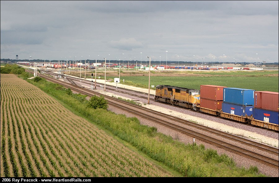 UP's Global 3 as seen from the new highway overpass at Flagg. The eastbound is pulling into the sprawling yard out in the cornfields. | |||||