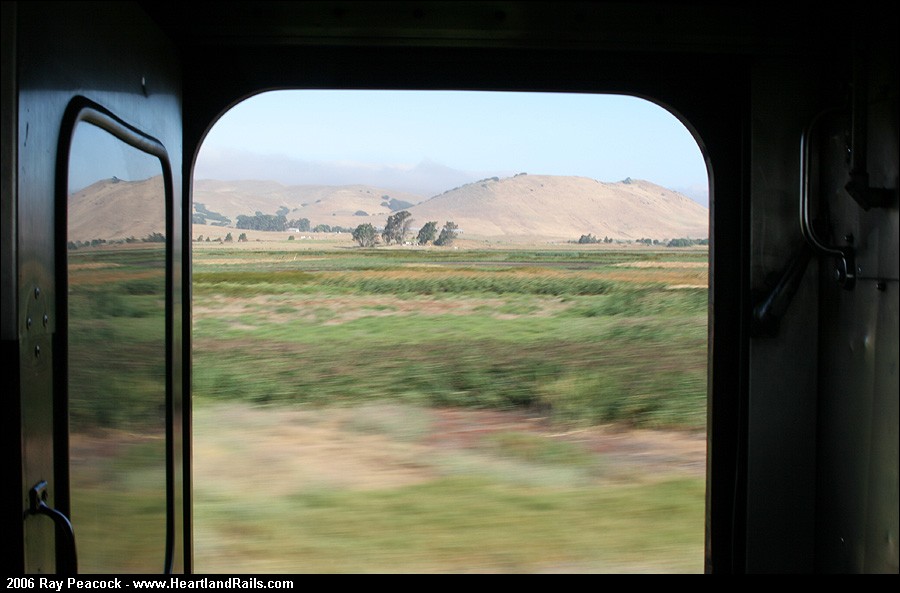 View out the vestibule window of the passing Sacramento River valley delta heading northward towards Fairfield, CA.