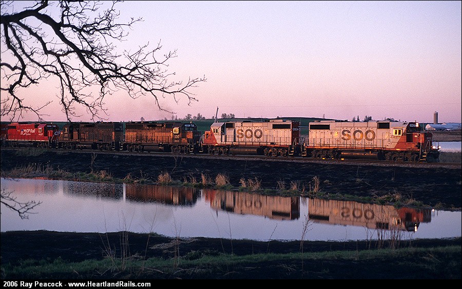 SOO 4427 takes the M&P turn to Madison from Portage past Goose Pond at sunset.