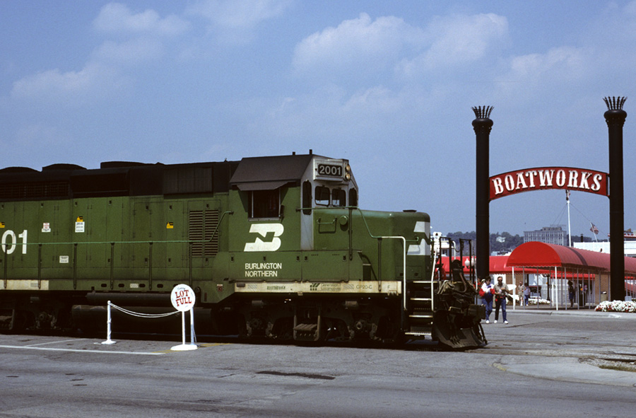 BN Caterpillar re-engined motor passes the casino in Rock Island.