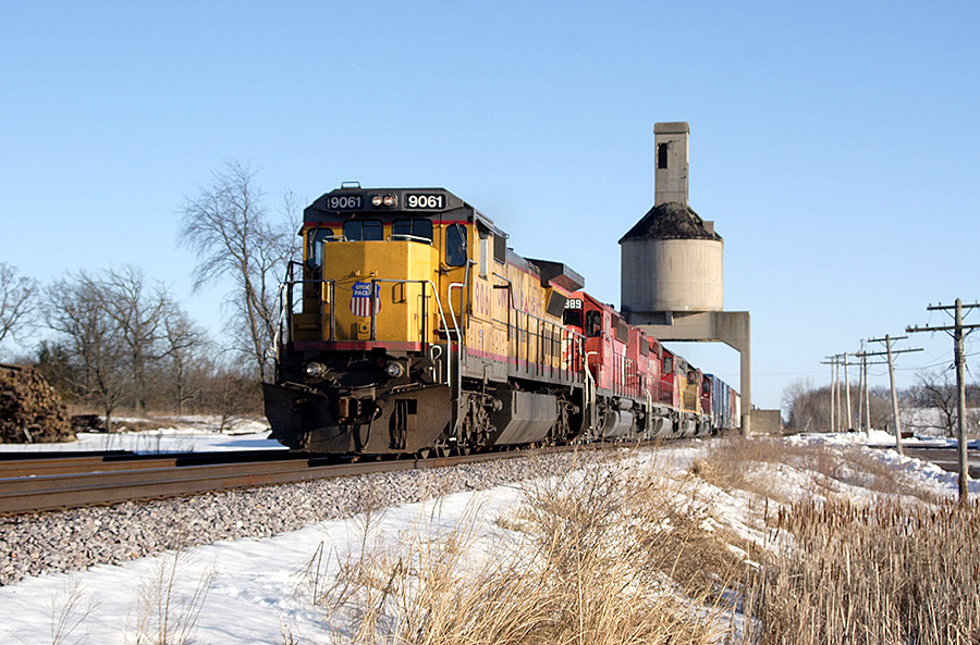 UP MPRIT westbound rolls under the old coaling tower at Clyman Jct.