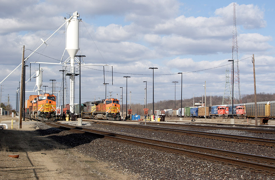 CN yard overview at Battle Creek. The fuel pad was installed on the main line, since crews change here anyway.