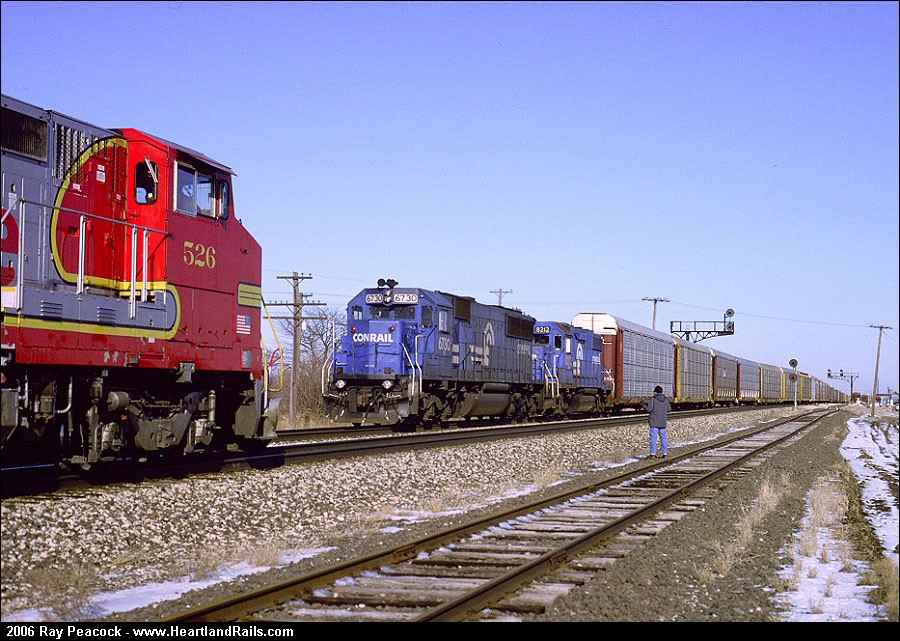 | Westbound CR crosses over in front of ATSF 526 at "GI" on the west side of Galesburg and gets a roll by from the Conductor of the Santa Fe train. This is a CR "Streator connection" train. | |||||