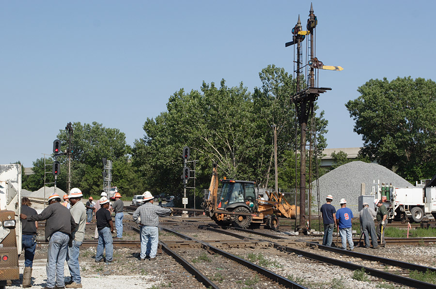 Backhoes with pincher-like devices grab sections of rail and remove them.