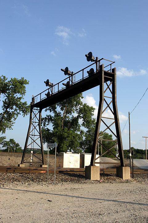 Old Santa Fe signal bridge still works for BNSF just west of Argentine Yard at Morris.