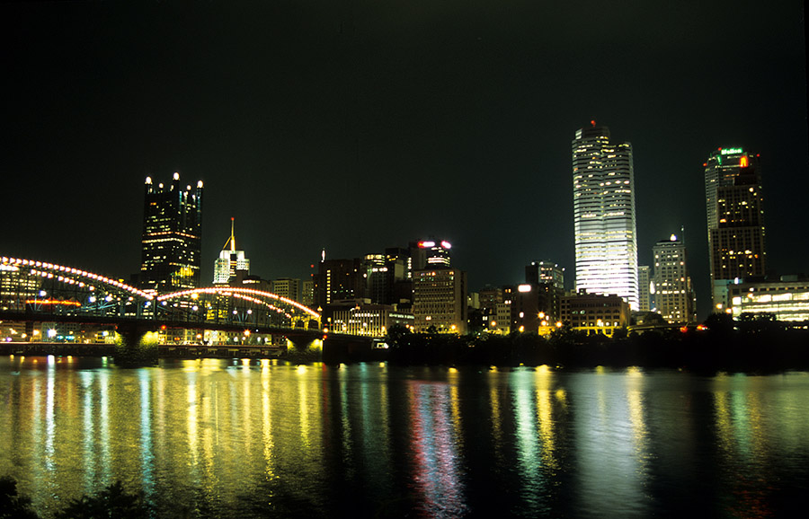 The view of downtown Pittsburg at night as seen from the PLE main.