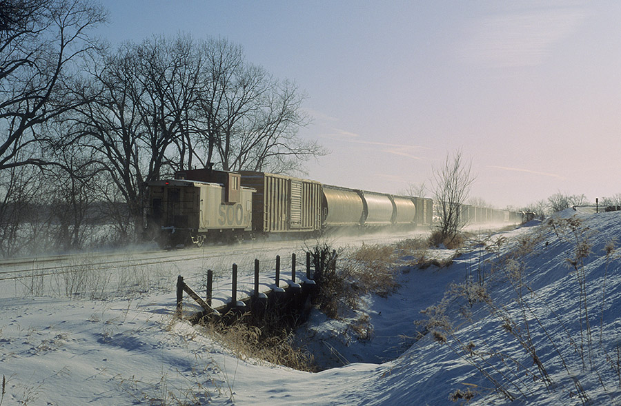 The Soo Winona Patrol kicks up the snow as it heads east at Donehower siding.