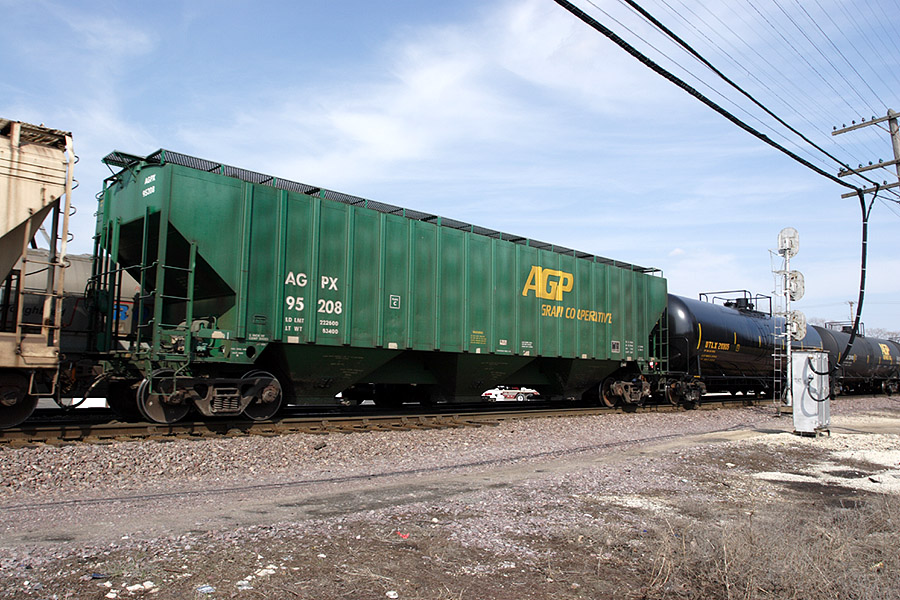 A grain car in the mix of a westbound at Cortland is labeled AGPX 95208.