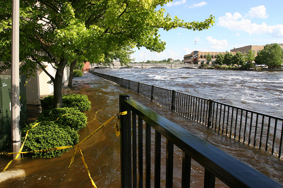 In downtown Janesville, the Rock River rushes by.