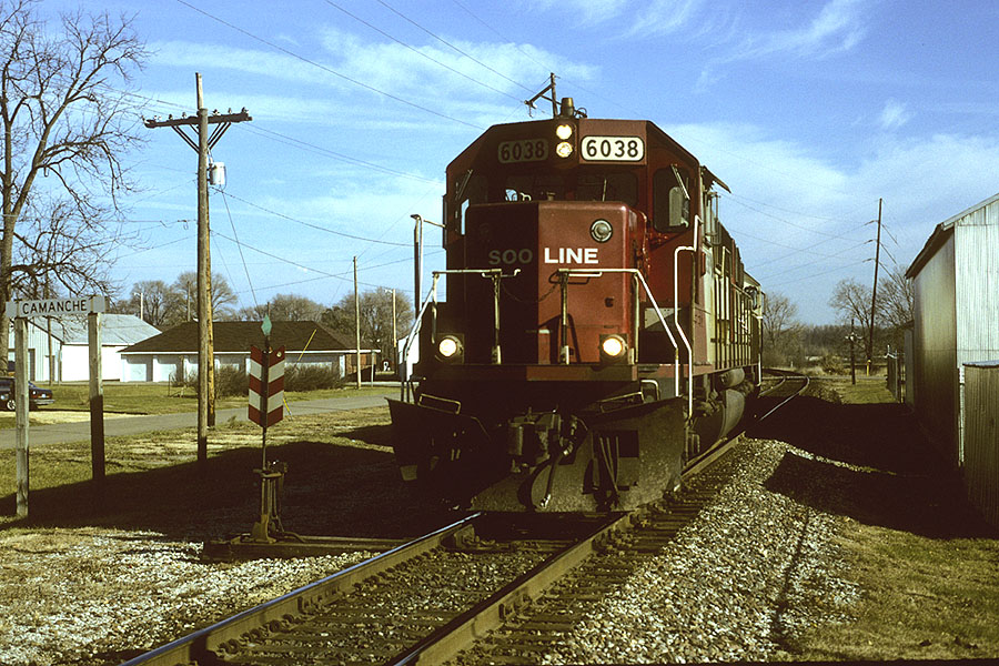 SOO 6038 pulls out of the siding at Camanche after a meet.