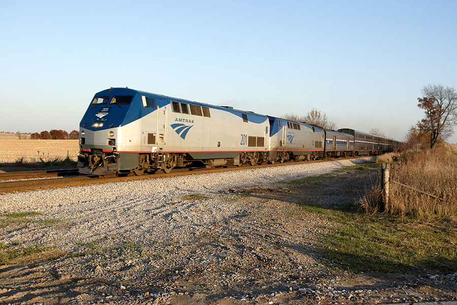 Amtrak train #7, the Empire Builder, streaks by a few miles from its stop in Columbus.