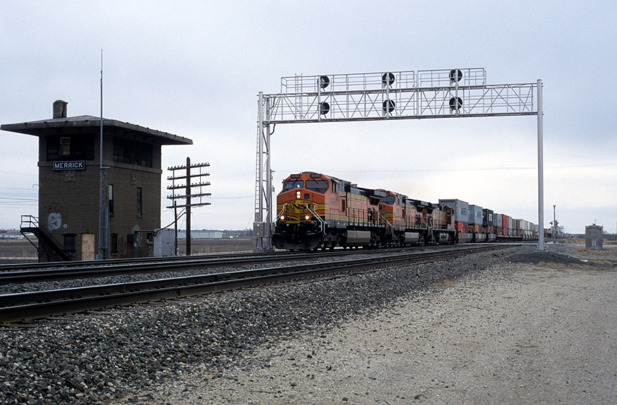 Merrick Tower guarded a busy Santa Fe junction for years before being taken out of service. A westbound passes. | |||||