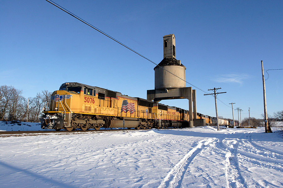 Westbound train MPRSS heads under the old coal chute just before the sun sets.