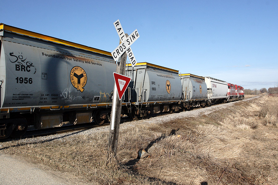 WSOR will shove these BRC ballast cars back into the pit for loading as they have passed the switch to back into Michaels Pit, a gravel and stone quarry. | |||||