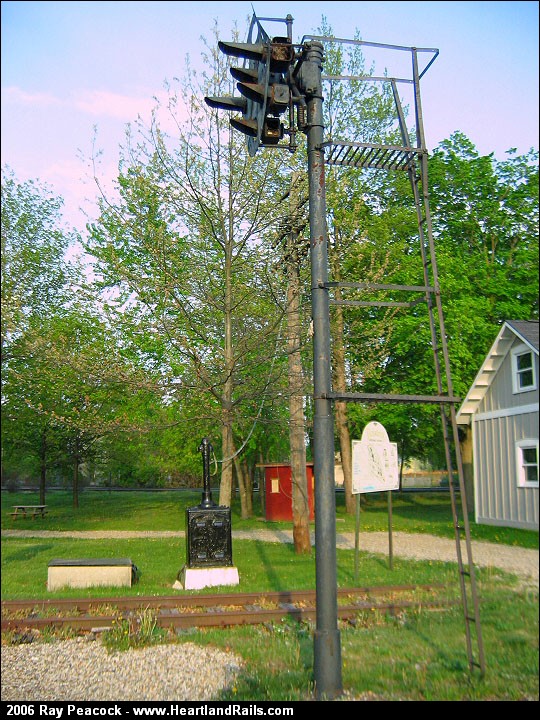 | This signal still stands where it stood since the it was erected. It was the southbound absolute for the PRR at the Vicksburg crossing of the GTW. The only thing it protects anymore is the birds who've nested at the top light cylinder. | |||||