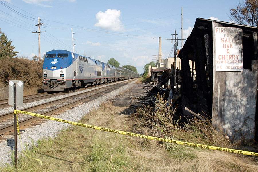 | Amtrak slows for a station stop at Columbus, passing a recent arson site. Track two on the right is out of service due to maintenence unrelated to that fire. | |||||