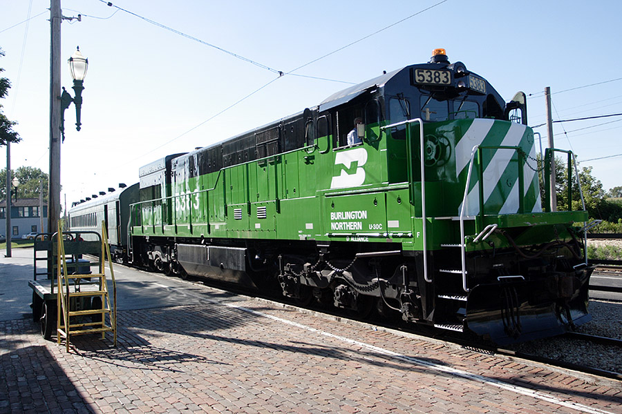 BN 5383 spent most of her service life hauling coal from the fields in Wyoming, today a more leisurly assignment pulling the museum passenger train into the depot at Union. | |||||