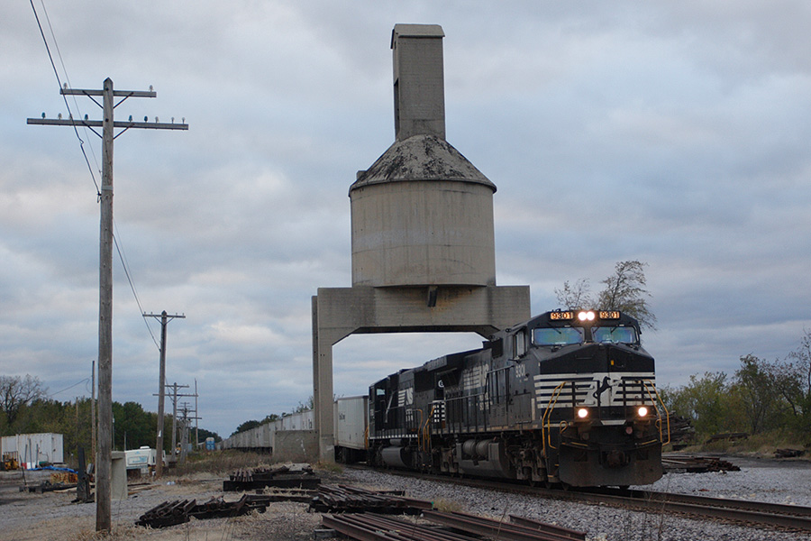 A NS Triple-Crown roadrailer is held at Clyman Jct. for trackwork ahead.