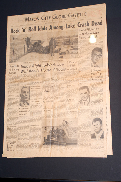 | The headlines of February 4, 1959. This is inside the Surf Ballroom, a nice side trip just 10 miles from Mason City. A must see for all rock and roll fans. | |||||