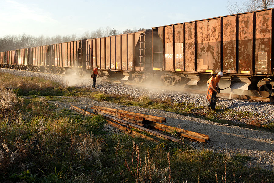 The crews regulate the flow of ballast out the chutes as the train slowly shoves forward at walking speed.
