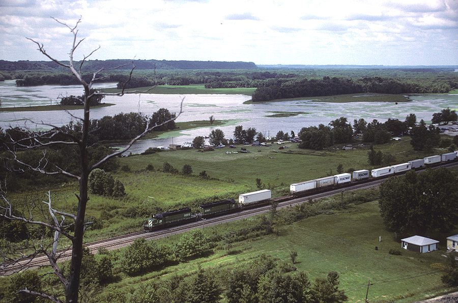 A view of the Mississippi River below as BN train #44 skirts the river below nearing Savanna.