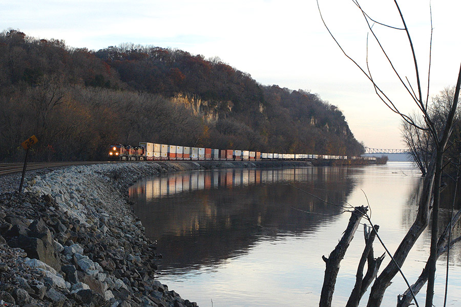 A hot piggyback train makes the bend around the Palisades at Savanna.