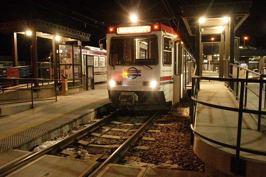 Front Runner cars are loading for departuret next to the Amtrak platform.