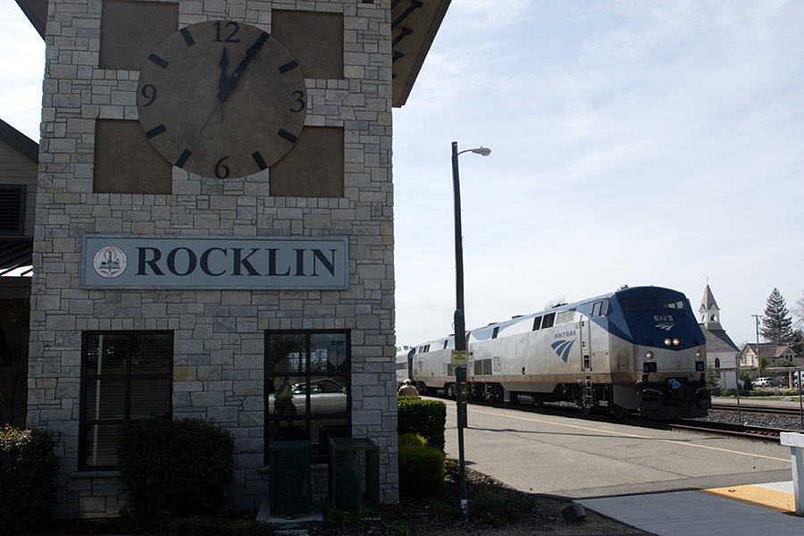 The Reno Fun Train makes an appearance passing the Rocklin depot at the foot of the Sierras.