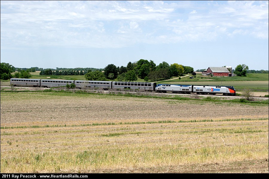A short Empire Builder rolls past farms of SE Wisconin. Flooding has caused the route to terminate at Minneapolis. | |||||