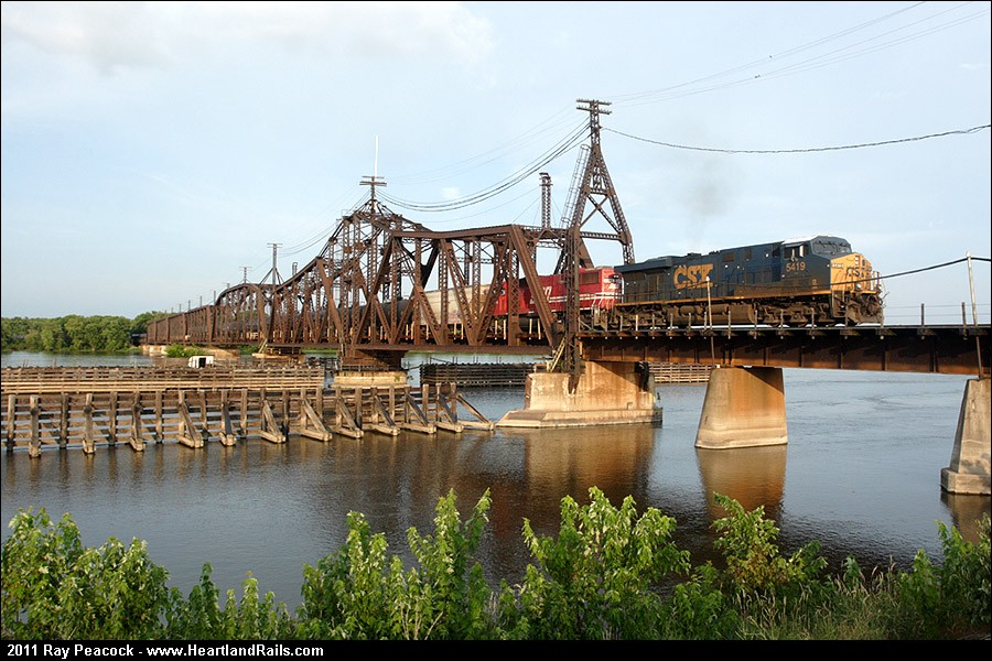 A CSX-led ethanol empty crosses the bridge into Iowa.