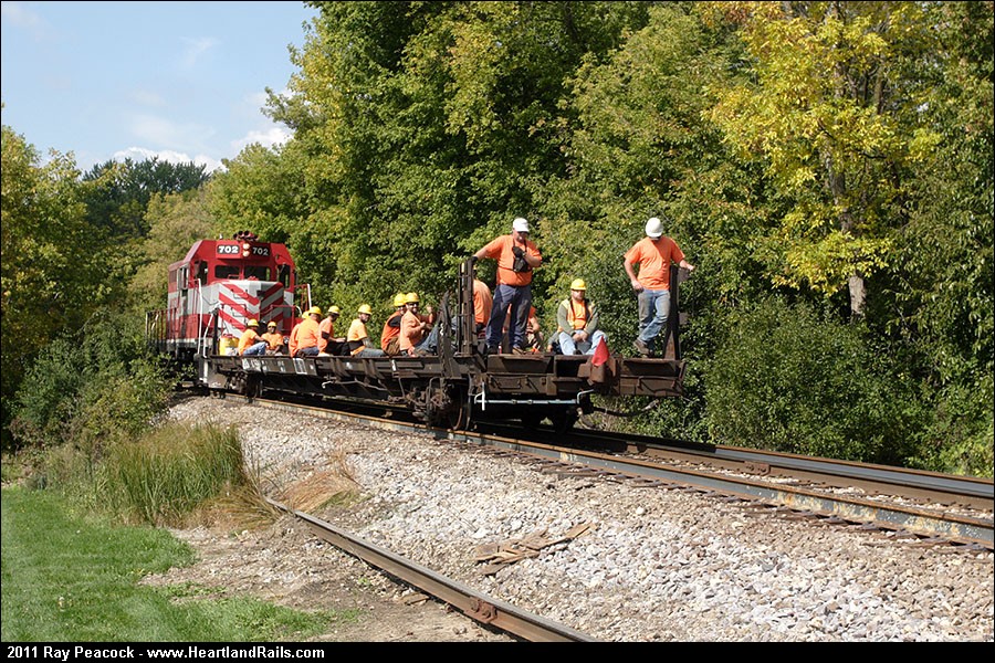 This crew is returning to McFarland, where additonal tie plates will be loaded onto the flatcar, to be dropped manually along the right of way later in Madison by these workers. | |||||