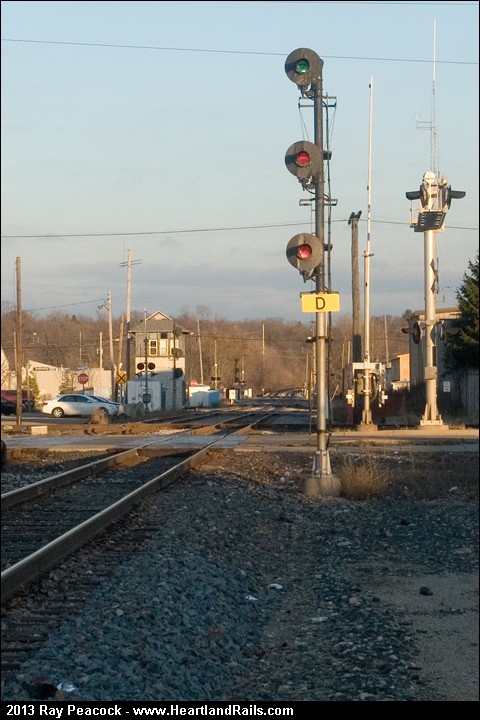 | Amtrak is on the circuit and is lined through the plant at BO Tower, seen in the distance. The other tower that guarded the ex-PRR tracks was situated where the cement is seen just past the street crossing on the left. It was preserved and is at a nearby auto museum. If you look closely, you will see the ex PRR tracks crossing. | |||||