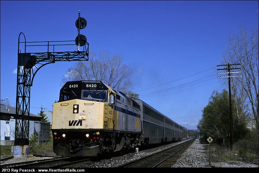The International Limited, Amtrak train #365, is running with pooled VIA power today, passing an old steam-era signal landmark in Lansing on the Grand Trunk. | |||||