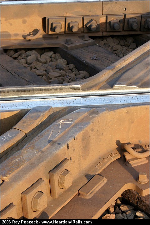 This is what is known as a "OWLS" crossing, "one way low speed". It lifts the wheel of the low speed (light density) RR such that the flange is clear of the head of the rail on the high speed (heavy density) RR, BNSF. | |||||