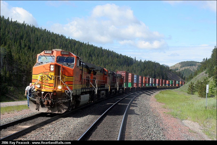 Coming down the east slope near Browing at MP 1150 on the BNSF ex GN Highline, Amtrak 8 passes a freight.