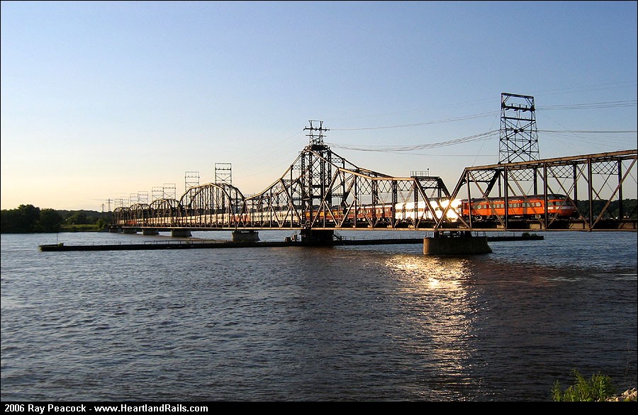 With the Milwaukee 261 engine cut off, the passenger train it pulled into Rock Island crosses over to the Iowa side of the river on the Crescent Bridge, powered by the auxiliary Amtrak engine. | |||||